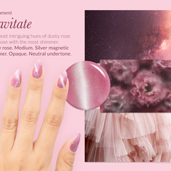 Dusty rose. Medium. Silver magnetic shimmer. Opaque. Neutral undertone.
